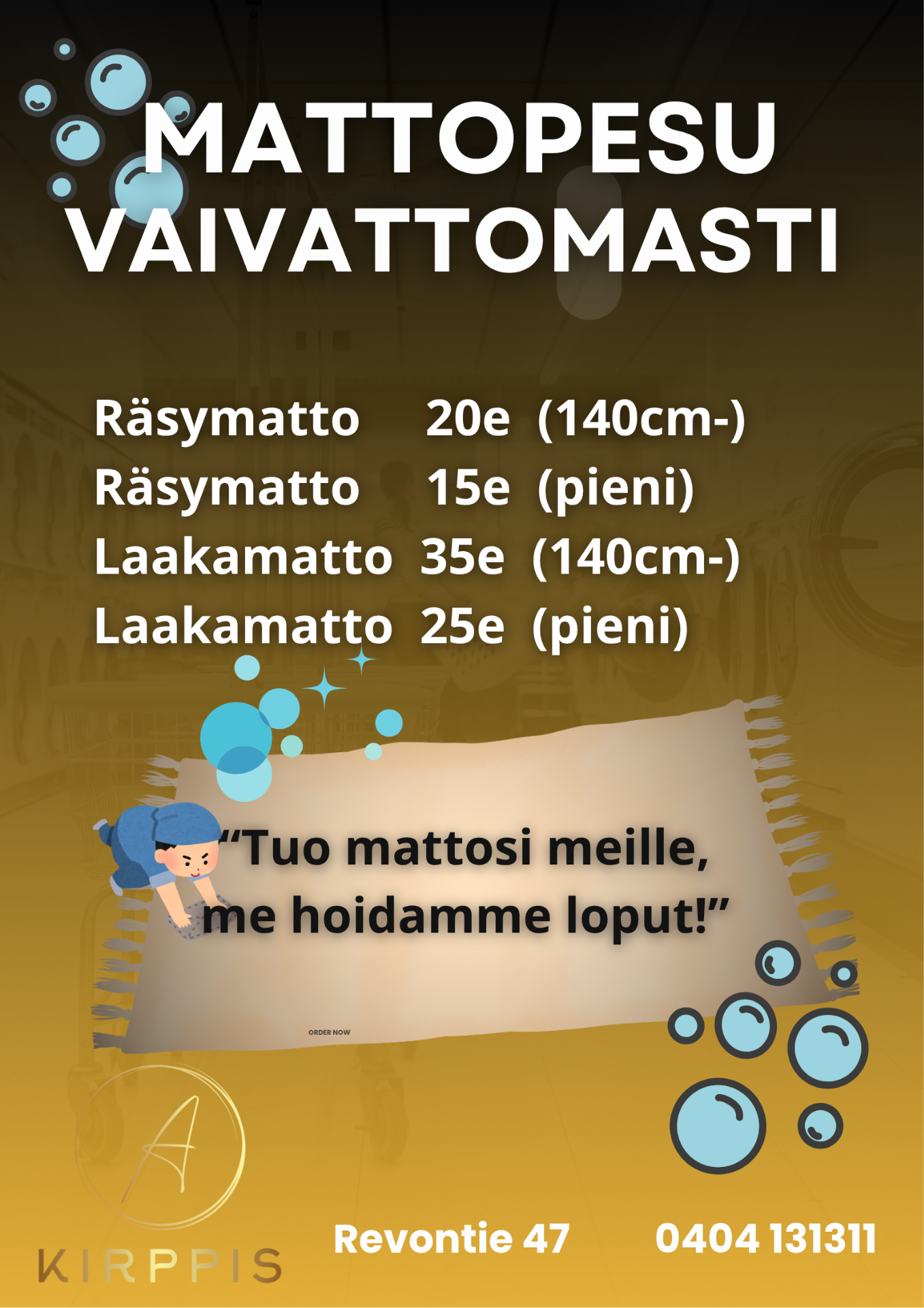 Uusi mattokuorma lähtee pesulaan heti kun rullakko täysi.